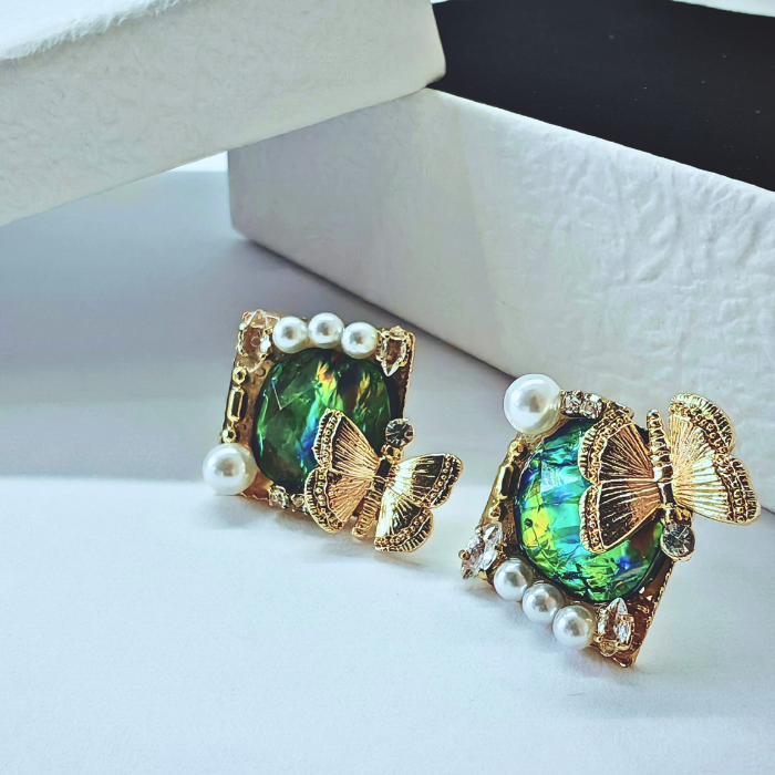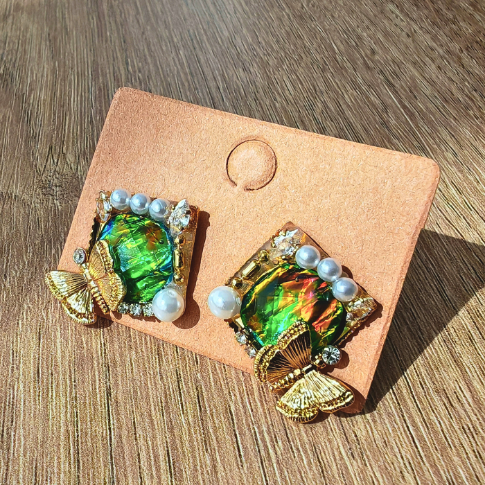角度や光の加減で赤や青に変化する偏光の輝きを閉じ込めたデザインピアス。