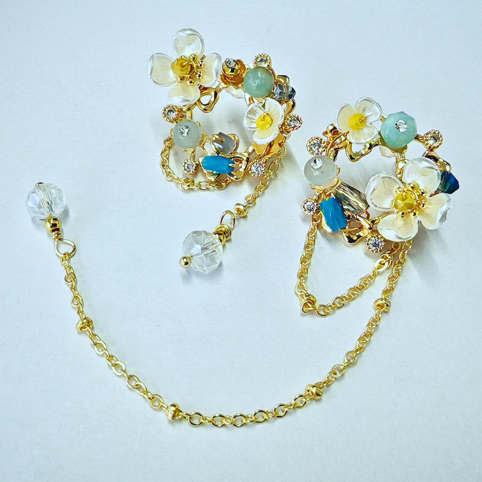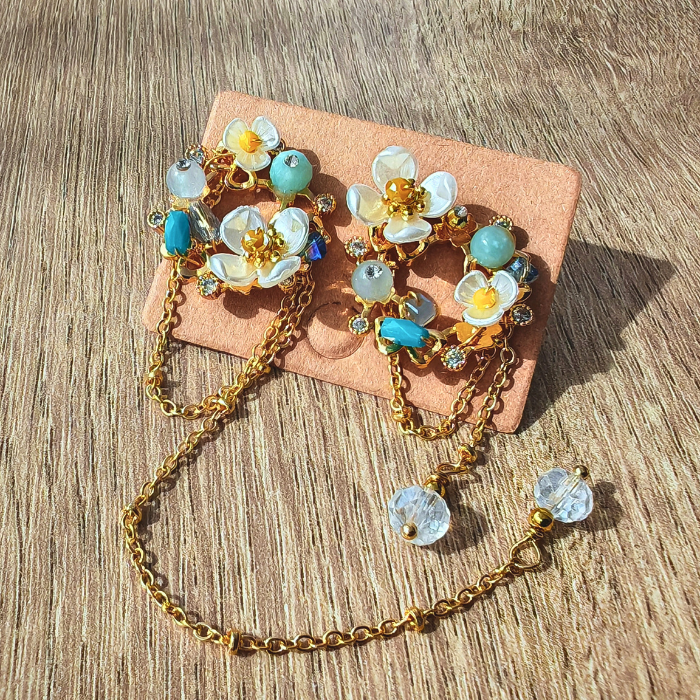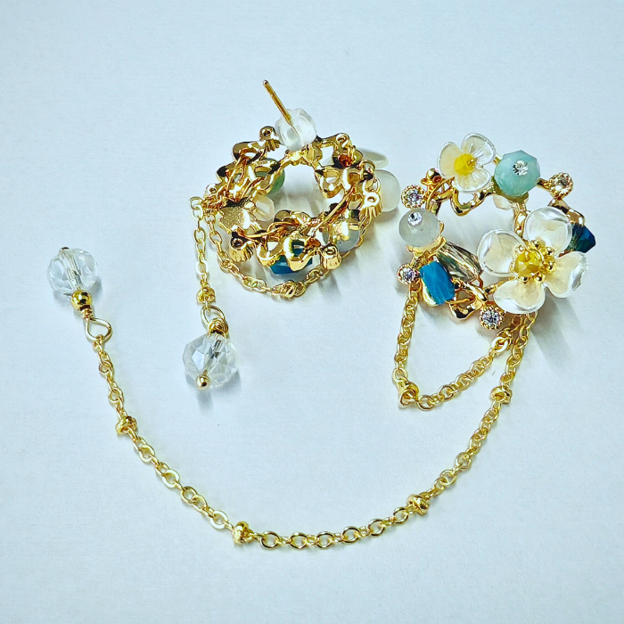 花束のきらめきと揺れるチェーン、耳元を華やかに。